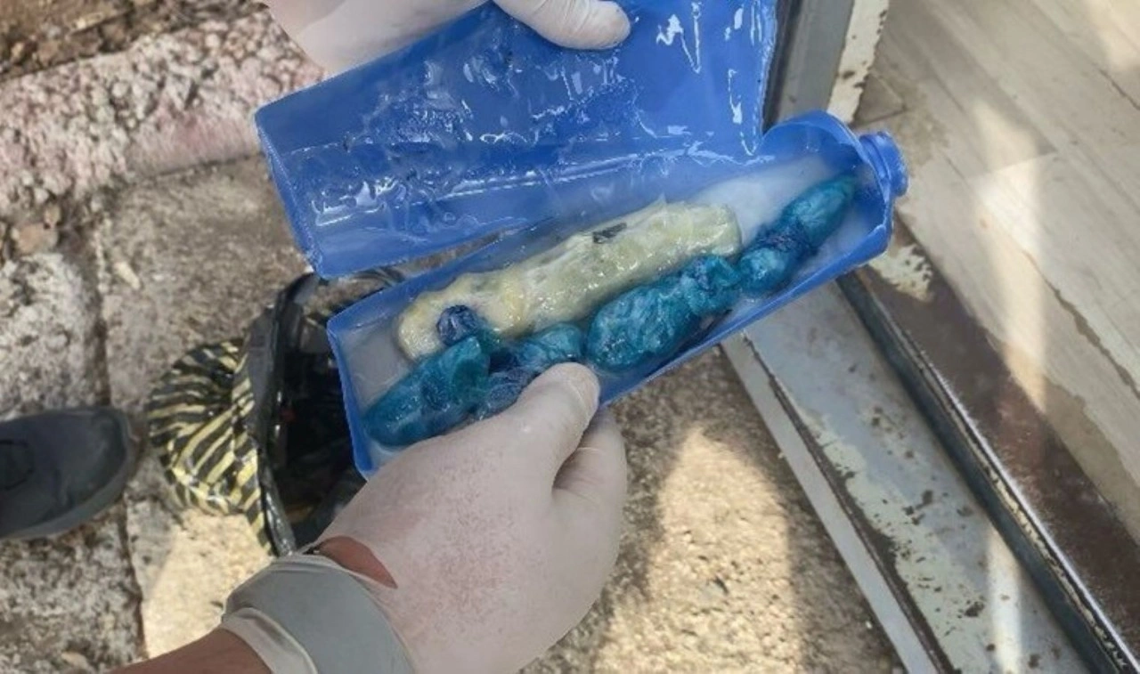 Şüphe üzerine yapılan detaylı aramada, şampuan şişesi içine gizlenmiş 5 ayrı paket halinde toplam 54,11 gram tütüne emdirilmiş uyuşturucu madde ele geçirildi.