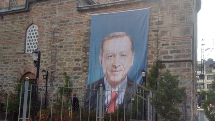 Bursa'da bir caminin duvarına AKP'li Cumhurbaşkanı ve Cumhur İttifakı'nın cumhurbaşkanı adayı Recep Tayyip Erdoğan'ın posterinin asılması tepkiye neden oldu.