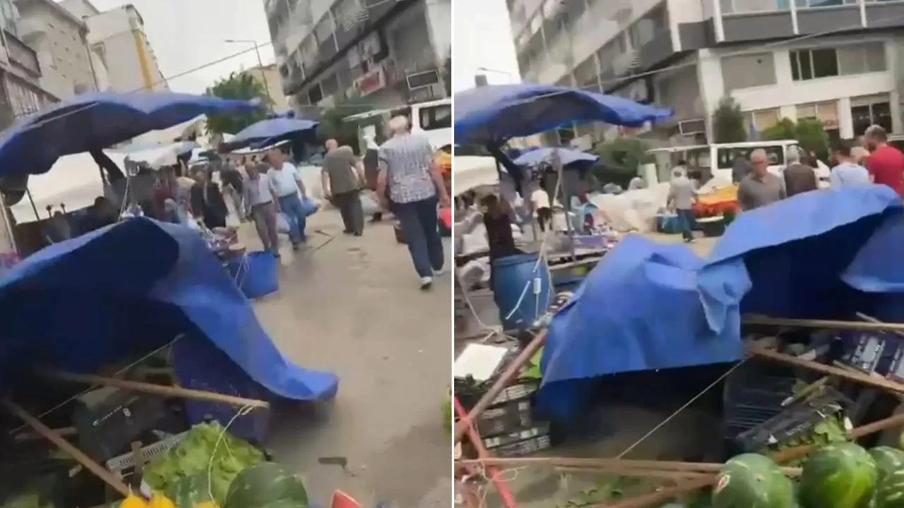 Pazarcıların devrilen çadırları uçmaması için tuttuğu anlar cep telefonu kamerasıyla kaydedildi.