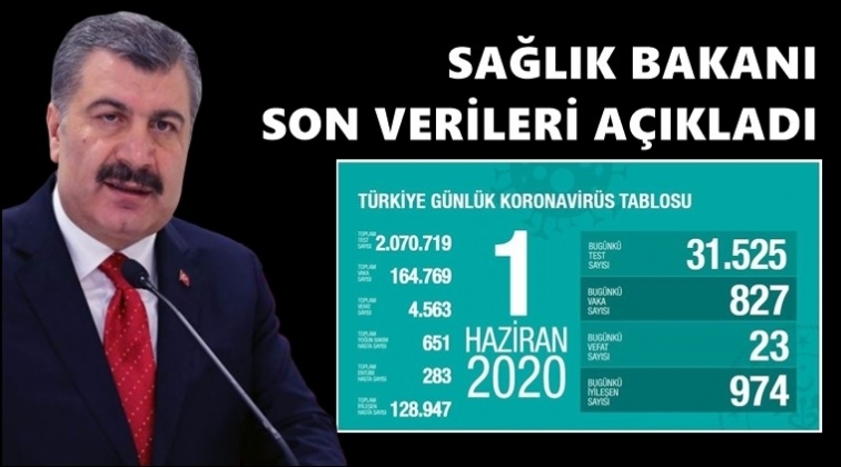 Sağlık Bakanı Fahrettin Koca, Türkiye'deki güncel corona virüsü verilerini açıkladı. Son 24 saatte 23 kişi hayatını kaybederken 827 yeni vaka görüldü. Toplam vaka sayısı 164 bin 769'a toplam can kaybı da 4 bin 563'e yükseldi. Dün 25 kişi hayatını kaybetmiş, 839 da yeni vaka tespit edilmişti.