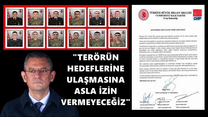 CHP Grup Başkanlığı geçtiğimiz 2 günde yaşanan terör saldırılarında 12 askerin şehit olması sonrası bir bildiri yayınladı. Bildiriyi sosyal medya hesabından paylaşan CHP Genel Başkanı Özgür Özel, "Terörün hedeflerine ulaşmasına asla müsaade etmeyeceğiz. Türkiye'nin bağımsızlığı ve bütünlüğü için mücadelemizi kararlılıkla sürdüreceğiz. Bunu yaparken de sorumluların arkasına dizilmeyeceğiz. Terörü kınamıyor lanetliyoruz! Milletimizin başı sağ olsun" açıklamasını yaptı.