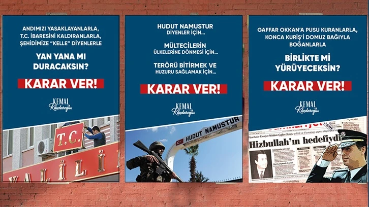 Afişlerde “Karar ver” çağrısı altında, “Andımızı yasaklayanlarla, şehide kelle diyenlerle, Türk ordusuna kumpas kuranlarla, 10 milyon mülteciyi içimize salanlarla, Gaffar Okkan’a pusu kuranlarla, depremde kan ve çadır satanlarla birlikte mi yürüyeceksin?” soruları yöneltildi.