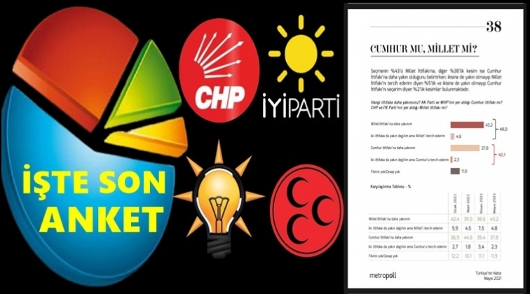 MetroPOLL Araştırma, 'Türkiye'nin Nabzı Mayıs 2021' araştırmasında, katılımcılara "Hangi ittifaka daha yakınsınız? AK Parti ve MHP'nin yer aldığı Cumhur İttifakı mı? CHP ve İYİ Parti'nin yer aldığı Millet İttifakı mı?" sorusunu yöneltti.