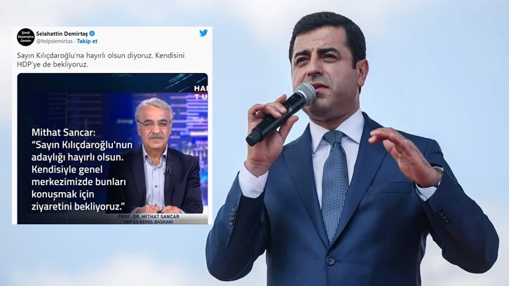 Twitter hesabından paylaşımda bulunan Demirtaş, HDP Eş Genel Başkanı Mithat Sancar'ın bugünkü sözlerine atıf yaparak "Sayın Kılıçdaroğlu'na hayırlı olsun diyoruz. Kendisini HDP'ye de bekliyoruz" dedi.