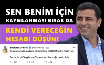 HDP Eş Genel Başkanı Selahattin Demirtaş, Cumhurbaşkanı Recep Tayyip Erdoğan'ın kendisine yönelik sözlerine "Sen benim için 'kaygılanmayı' bırak da kendi vereceğin hesabı düşün" yanıtını verdi.