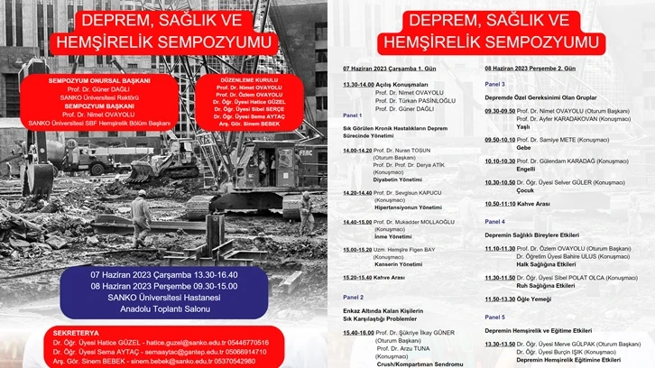 SANKO Üniversitesi Sağlık Bilimleri Fakültesi (SBF) Hemşirelik Bölümü tarafından “Deprem, Sağlık ve Hemşirelik” konulu sempozyum düzenlenecek.