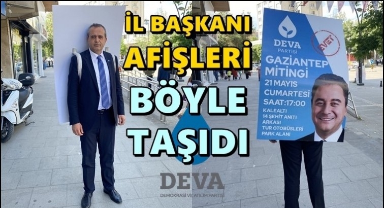 Gaziantep'te mitingi yasaklanan DEVA Partisi'nin İl Başkanı Ertuğrul Kaya, asılması için izin verilmeyen afişleri üzerinde taşıyarak yurttaşlara çağrı yaptı.