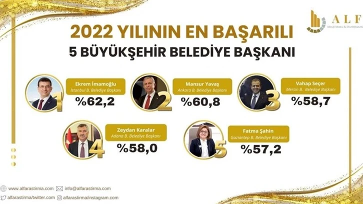 ALF araştırma şirketi, '2022 yılının en başarılı belediye başkanları' araştırmasının sonuçlarını kamuoyuyla paylaştı. Araştırma, 30 büyükşehirde 14 bin kişiyle yapıldı.
