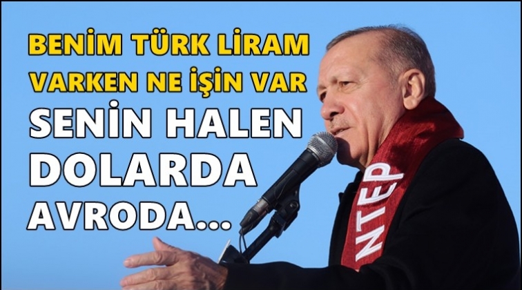 Erdoğan, "Benim Türk liram varken ne işin var senin halen yok dolardı, yok avroydu. Türk lirası, Türk lirası, alışacaksınız buna" dedi.
