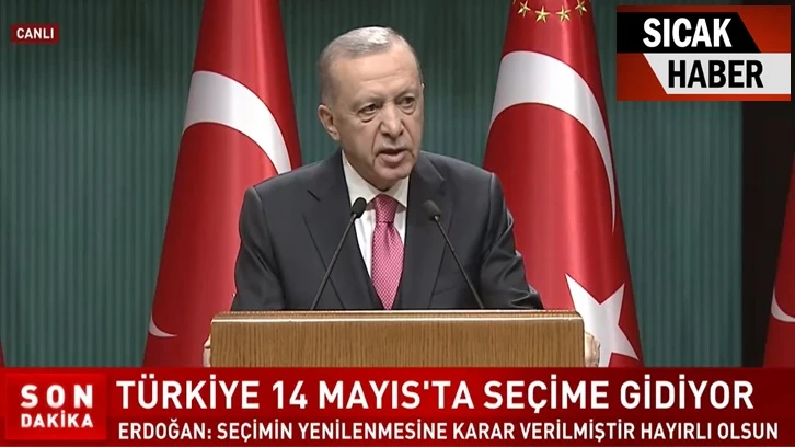 Erdoğan, Saray'da açıklama yaparak seçimin yenilenmesine ilişkin kararı imzaladı. Erdoğan, "Anayasamızın 116’ncı maddesinin verdiği yetkiyle, 18 Haziran 2023'te yapılması gereken seçimlerin 14 Mayıs’ta yenilenmesi kararını imzaladım" dedi.