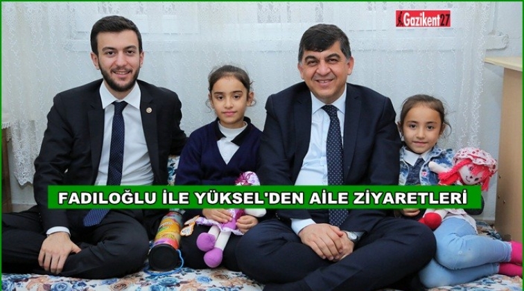 Şehitkamil Belediye Başkanı Rıdvan Fadıloğlu ile AK Parti Gaziantep Milletvekili Müslüm Yüksel, gerçekleştirdiği ev ziyaretleri kapsamında 2 aileye misafir oldu. Ailelerin sorunlarını dinleyen Başkan Fadıloğlu ile Milletvekili Yüksel, yetim çocuklarla yakından ilgilendi.