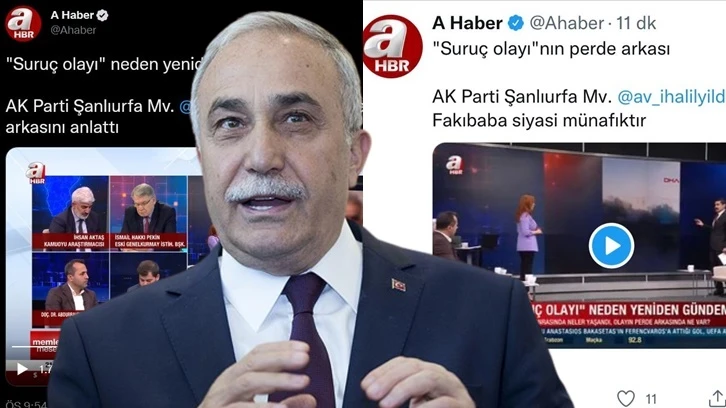 A Haber’e dün konuk olan AKP Şanlıurfa Milletvekili İbrahim Halil Yıldız, Şenyaşar ailesini hedef alarak terörist olduklarını iddia etti. Yaşanan olaya tepki gösteren ve İYİ Parti’ye geçen eski AKP Şanlıurfa Milletvekili Ahmet Eşref Fakıbaba’yı canlı yayında hedef alan Yıldız, “Siyasi münafık” dedi. A Haber Twitter hesabından Yıldız’ın sözlerini paylaştıktan sonra sildi. A Haber’in sildiği paylaşım ve sonrasında paylaştığı yeni tweet şöyle: