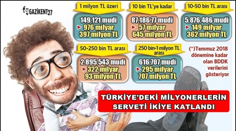 Bankacılık Düzenleme ve Denetleme Kurumu'nun (BDDK) mevduat raporuna göre temmuz ayı itibarıyla yurtiçinde yerleşik milyonerlerin mevduatlarının 444 milyar 734 milyon lirası yerel para cinsi, 527 milyar 398 milyon lirası döviz tevdiat hesabı, 4 milyar 264 milyon lirası kıymetli maden depo hesaplarından oluştu. Yurtiçinde yerleşik milyoner başına düşen ortalama mevduat da 6 milyon 547 bin lira olarak hesaplandı.