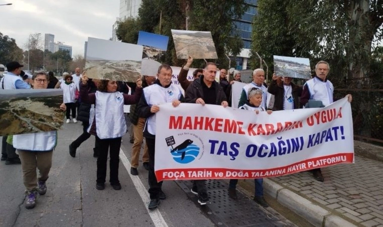 İzmir’in Foça ilçesi Kocamehmetler Mahallesi mevkiinde Kamil Özgüle ve Çetin Damba tarafından işletilen iki ayrı taş ocağına karşı açılan davayı kazanan Foçalılar, ocakların kapatılması için İzmir Valiliği Çevre, Şehircilik ve İklim Değişikliği İl Müdürlüğü önünde toplandı. Foça Tarih ve Doğa Talanına Hayır Platformu’nun çağrısıyla İZBAN Bayraklı durağından bakanlık önüne kadar “Mahkeme kararını uygula taş ocağını kapat” pankartı ile yürüyen yurttaşlar, “Zafer direnen köylülerin olacak”, “Havama, suyuma, toprağıma dokunma” sloganları attı.