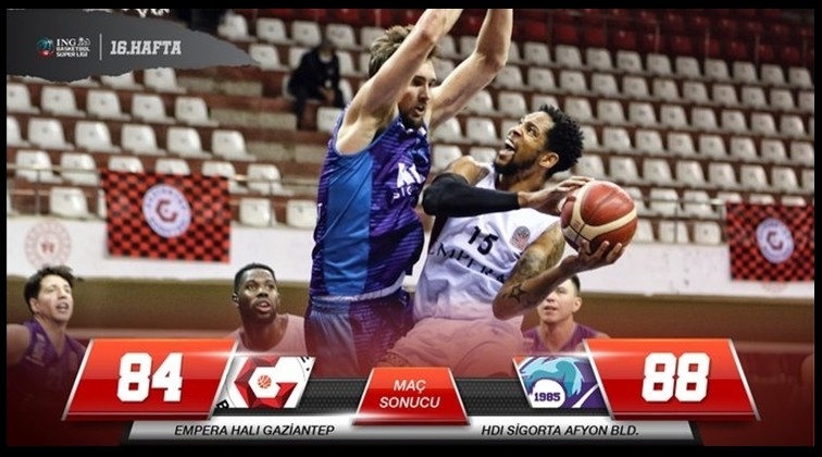 ING Basketbol Süper Ligi'nin 16. haftasında HDI Sigorta Afyon Belediyespor, deplasmanda Empera Halı Gaziantep Basketbol'u normal süresi 77-77 berabere biten karşılaşmada 88-84 yendi.