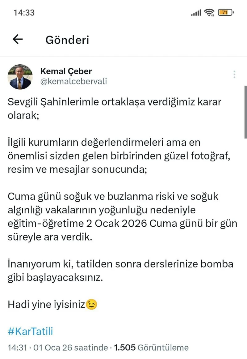 Vali Kemal Çeber yaptığı açıklamada, “Sevgili Şahinlerimle ortaklaşa verdiğimiz karar olarak; İlgili kurumların değerlendirmeleri ama en önemlisi sizden gelen birbirinden güzel fotoğraf, resim ve mesajlar sonucunda; Cuma günü soğuk ve buzlanma riski ve soğuk algınlığı vakalarının yoğunluğu nedeniyle eğitim-öğretime 2 Ocak 2026 Cuma günü bir gün süreyle ara verdik. İnanıyorum ki, tatilden sonra derslerinize bomba gibi başlayacaksınız. Hadi yine iyisiniz” ifadelerine yer verdi.
