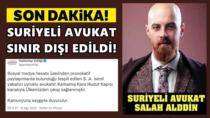 Gaziantep Valiliği'nin sosyal medya hesabından yapılan açıklamada, "Sosyal medya hesabı üzerinden provokatif paylaşımlarda bulunduğu tespit edilen S. A. isimli yabancı uyruklu avukatın Karkamış Kara Hudut Kapısı kanalıyla Ülkemizden çıkışı sağlanmıştır. Kamuoyuna saygıyla duyurulur." ifadeleri kullanıldı.