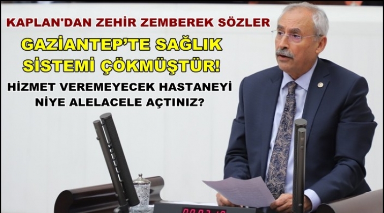 Kaplan, Gaziantep İl Sağlık Müdürü’nün, Gaziantep’teki hastaneler ile yaptığı açıklamaya dikkat çekerek, “Bakın Gaziantep’te sağlık çökmüş durumda. Basın ve kamuoyuna yansıyan skandallar silsilesine bugün İl Sağlık Müdürü’nden açıklama gelmiş. İl Sağlık Müdürü açıklamasında diyor ki; “hizmete tam anlamıyla alınamaması fiziki eksikliklerden değil, başka illerde de görülen doktor eksikliklerindendir.” Abdulkadir Yüksel Devlet Hastanesini yaptınız, hastanede hizmet verecek doktor bulamadınız. Hastanenin ruhsat problemi olduğundan ameliyat yapılamıyor, tam teşekküllü hizmet veremiyor. Hizmet veremeyeceğiniz bir hastaneyi niye açtınız? Gerek sağlık çalışanlarının verimli ve huzurlu çalışabilmeleri için, gerek vatandaşlarımızın nitelikli sağlık hizmeti alabilmeleri için biran önce Gaziantep’e sağlık personeli atanmalıdır. Abdülkadir Yüksel Hastanesi tam kapasiteyle hizmet vermeye başlamalıdır. Buradan Sayın Sağlık Bakanına sesleniyorum. Gaziantep’i artık sağlığına kavuşturun” diye ifade etti.