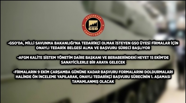 Askeri Fabrikalar Genel Müdürlüğü ve Gaziantep Sanayi Odası işbirliğinde “Onaylı Tedarikçi Belgesi Bilgilendirme Toplantısı ve AFGM Yetkilileriyle Başvuru Değerlendirme Görüşmeleri” 15 Ekim 2019 Salı günü sabah saat 09:30’da başlayacak.