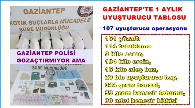 Gaziantep polisinin 1 ayda gerçekleştirdiği 107 uyuşturucu operasyonunda, 114 kişi tutuklandı. Operasyonlarda 9 kilo esrar, 134 kilo eroin, 15 kilo ateş buz, 29 bin adet uyuşturucu hap, 344 gram bonzai, 53 gram kenevir tohumu, 30 adet kenevir bitkisi ele geçirildi.