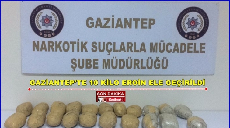 Gaziantep Emniyet Müdürlüğü'nden yapılan açıklamada, "Narkotik Suçlarla Mücadele Şube Müdürlüğü ekiplerimizce, İlimiz genelinde daha sağlıklı ve güvenli ortamın oluşması, sokak suçlarının azalması için uyuşturucu madde imal ve ticareti ile uyuşturucu satıcılarının yakalanmalarına yönelik yürütülen çalışmalar sonucunda; İlimiz Doğu Otoban Gişelerinde yapılan uygulamada, bir aracın bagaj kısmında bulunan yedek lastiğe zulalanmış 21 adet koli bandı ile sarılı 10 kilo 450 gram eroin maddesi ele geçirildi. Olayla ilgili 2 şahıs gözaltına alındı. Şüpheli şahısların adli işlemleri devam etmektedir." denildi.