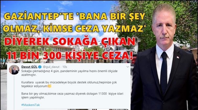 Gaziantep Valisi Davut Gül, sosyal medya hesabından yaptığı paylaşımda, "Sokağa çıkmadığınız 4 gün, pandeminin yayılma hızını önemli ölçüde azaltmıştır. Kurallara uyarak bu mücadeleye büyük destek oldunuz,hepinize çok teşekkür ediyorum. Bana bir şey olmaz,kimse ceza yazmaz diyerek dolaşan 11300 kişiye idari işlem yapılmıştır." dedi.