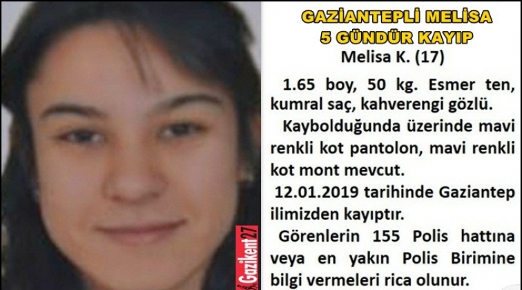 Gaziantep Emniyet Müdürlü tarafından kayıp alarmı olarak sms ile her yerde aranan 17 yaşındaki Melisa K., 12 Ocak tarihinden beri haber alınamıyor. Kaybolduğunda üzerinde mavi kot pantolon, mavi renkli kot mont bulunan Melisa'yı görenlerin 155 polis imdat hattına haber vermesi istendi.