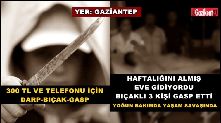 Gaziantep Emniyet Müdürlüğü'nden yapılan açıklamaya göre, 01 Aralık 2018 günü Beydilli Mahallesi'nde M.M. isimli mağdur şahıs; çalıştığı işyerinden haftalığını alıp evine doğru gittiği sırada, tanımadığı üç şahıs tarafından darp edilerek hayati tehlike arz edecek şekilde bıçakla yaralandı. Cep telefonu ve 300 TL parası gasp edilen mağdur M.M. isimli şahısın Dr. Ersin Arslan Hastanesi'nde yoğun bakım ünitesinde tedavisi sürüyor.