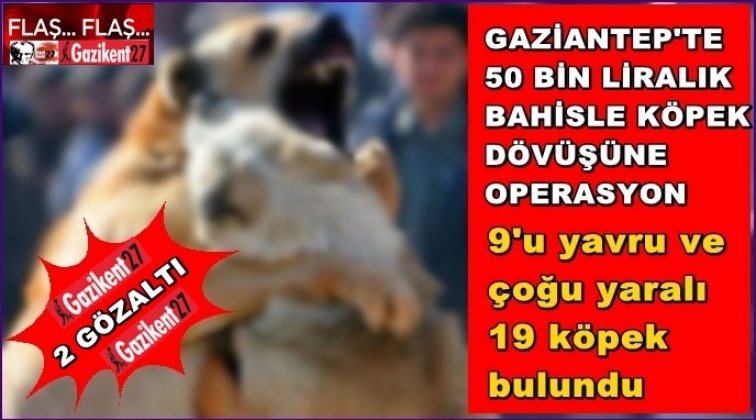 Edinilen bilgiye göre, Oğuzeli'nde 50 bin lira bahisle köpek dövüştüren kişilerin çektikleri görüntüleri sosyal medyadan paylaşması üzerine harekete geçen hayvanseverler, jandarmaya ihbarda bulundu. Jandarma ekipleri tespit edilen eve operasyon düzenledi. Operasyonda, bahis karşılığında dövüştürüldükleri belirlenen 9'u yavru ve çoğu yaralı 19 köpek bulundu. Köpekler Gaziantep Hayvanat Bahçesi'ne teslim edilirken, jandarma Ş.Ö. ve H.İ.Ö.'yü gözaltına aldı.