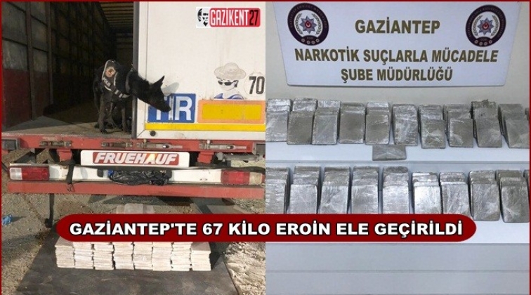 Gaziantep Emniyet Müdürlüğü'nden yapılan açıklamaya göre, Narkotik Suçlarla Mücadele Şubesi ekipleri, yurt dışından temin ettikleri uyuşturucuyu tırla yurda getirdikleri belirlenen kişilerin yakalanması için çalışma başlattı. Polis ekipleri, Gaziantep'e geldiği belirlenen tırı, uzun süren takip sonucu Tarsus, Adana, Gaziantep (TAG) otoyolunda durdurdu. Araçta dedektör köpek "Onix"in desteğiyle yapılan aramada, dorsedeki özel yapılmış bölümde 131 paket halinde 67 kilogram eroin bulundu. Operasyonda gözaltına alınan şüphelilerden birinin tırın sürücüsü, diğer ikisinin ise baba-oğul olduğu belirtildi. Adliyeye sevk edilen zanlılar, nöbetçi mahkeme tarafından tutuklandı.