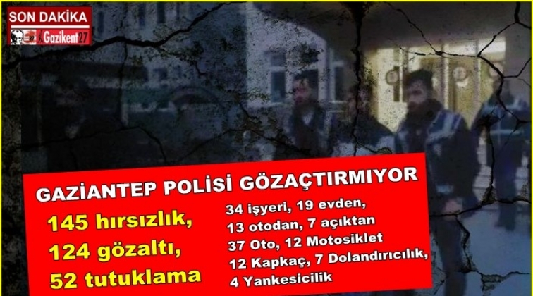 Gaziantep'te 01 Şubat - 9 Mart tarihleri arasında toplam 145 hırsızlık olayı aydınlatıldı. Hırsızlık olaylarına karışan 124 kişi gözaltına alınırken bunlardan 52'si tutuklandı.