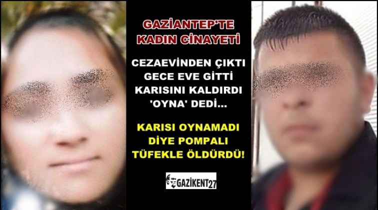 Gaziantep'te cezaevinden çıkan S.S, gece geç saatlerde geldiği evde karısını uyandırarak, oynamasını istedi. Karısının oynamayacağını söylemesi üzerine öfkelenen koca evdeki pompalı tüfekle karısını vurduğu iddia edildi.