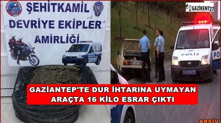 Gaziantep'te polisin yol uygulamasında dur ihtarına uymayarak kaçan bir araç kovalamaca sonucu yakalandı. Araçta yapılan aramada 16 kilogram esrar ele geçirilirken 2 kişi gözaltına alındı.