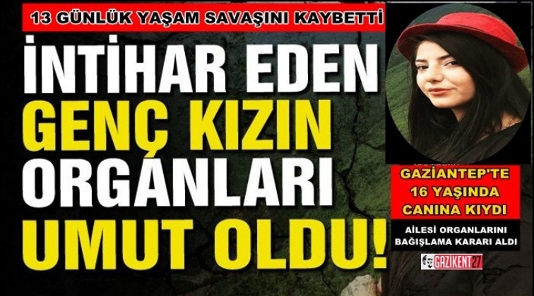 Gaziantep'te 13 gün önce evinde intihar eden ve yaşam savaşını kaybeden 16 yaşındaki lise öğrencisi Hilal Karabalık'ın organları 7 kişiye umut oldu.
