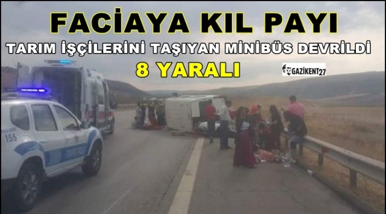 Edinilen bilgiye göre kaza, Nurdağı - Gaziantep otoyolunda meydana geldi. Osmaniye'den Gaziantep'e tarım işçilerini taşıyan Halit Gül (45) yönetimindeki minibüs, lastiğinin patlaması sonucu kontrolden çıkıp devrildi. Minibüste bulunanlar yola savrulurken, can pazarı yaşandı. Kazada 8 kişi yaralandı. Yaralılar ambulanslarla çeşitli hastanelere kaldırılarak tedaviye alındı.