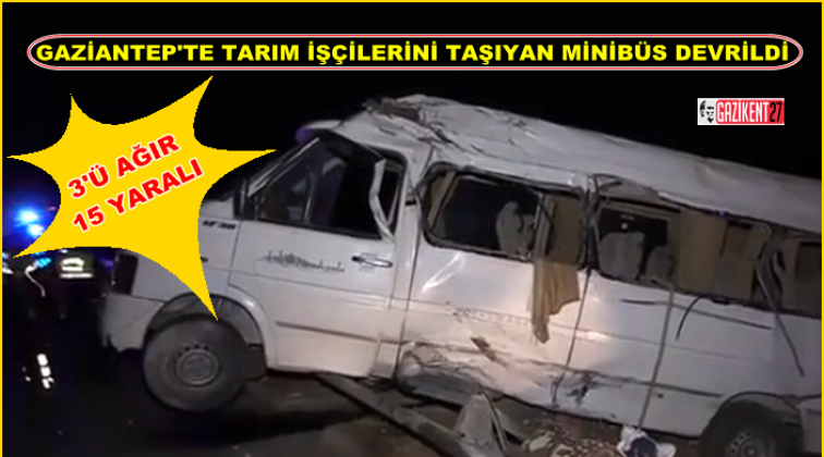 Edinilen bilgiye göre, tarım işçileri taşıyan minibüs, Gaziantep - Nizip karayolunun 22'nci kilometresinde devrildi. Kazada yaralanan sürücü ile 14 tarım işçisi Nizip Devlet Hastanesi'ne kaldırıldı. Hayati tehlikesi bulunan 3 işçi Gaziantep'teki özel hastanelere sevk edildi.