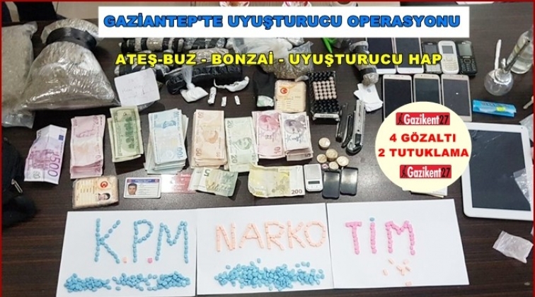 Gaziantep'te polisin uyuşturucu operasyonundabonzai, uyuşturucu hap, ateş buz ele geçirilirken, 4 kişi gözaltına alındı. Gözaltındaki 4 kişiden 2'si çıkarıldıkları mahkemece tutuklandı.