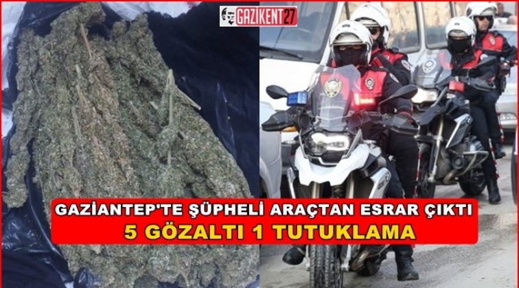 Edinilen bilgiye göre, motosikletli polis timlerinin Şehitkamil İlçesi eski Nizip yolu üzerinde yapılan uygulamada; durumundan şüphelenilerek durdurulan bir otomobil içerisinde yapılan aramada bin 570 gram uyuşturucu esrar maddesi ele geçirildi. Olayla ilgili araç içerisinde bulunan H.G., A.K., Z.K., B.G. ve E.K. isimli 5 şüpheli şahıs gözaltına alındı. Haklarında yapılan yasal işlemleri sonrası adli makamlara sevk edilen şüpheli şahıslardan E.K. tutuklandı.