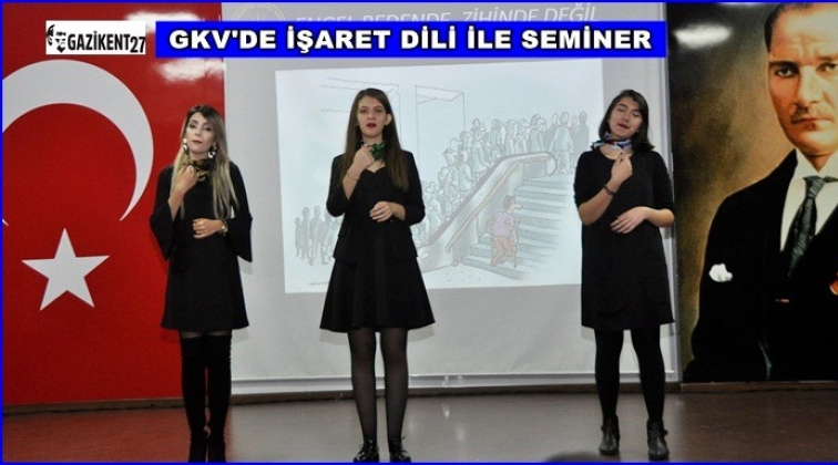 Gaziantep Kolej Vakfı Özel Okullarında düzenlenen ve işaret diliyle gerçekleştirilen seminer öğrencilerin büyük ilgisini gördü. Öğrencilerin de katılım gösterdiği söyleşi Gençlik ve Spor Bakanlığı’ndan onaylı işaret dili eğitimi belgesine sahip Psikolojik Danışma ve Rehberlik Servisi öğretmenlerinden Fatma Zehra Doğan tarafından gerçekleştirildi.  Seminere katılan GKV Özel Fen Lisesi, GKV Özel Cemil Alevli Koleji ve GKV Özel Anadolu Lisesi gönüllü öğrencileri arkadaşlarıyla birlikte engelli bireylerin günlük hayatta karşılaştıkları zorlukları ve onlara daha fazla nasıl yardımcı olunması gerektiği konusunda bilgileri işaret dilini de kullanarak paylaştılar.  Seminere izleyici olarak katılan öğrenciler arasından seçilen gönüllülerin gözlerini bağlayarak görme engelli, kulaklık takıp sesleri algılamalarını engelleyerek işitme engelli ve tekerlekli sandalye kullanarak yürüme engelli bireylerin yaşamlarını deneyimleyerek empati kurmaları sağlandı. Büyük ilgi gören seminerin sonunda öğrenciler hep birlikte “Sev Kardeşim” adlı şarkıyı işaret dili kullanılarak seslendirdi.