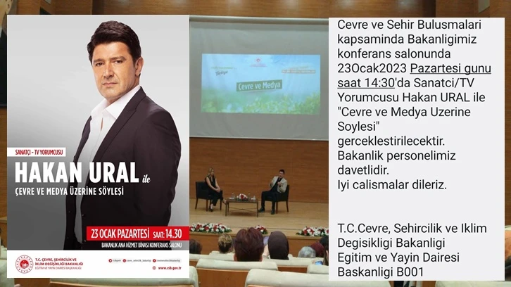 Çevre, Şehircilik ve İklim Değişikliği Bakanlığı, Hakan Ural’ı, "Çevre ve Medya Üzerine" konu başlıklı söyleyişe konuşmacı olarak çağırdı. Bakanlığa ait konferans salonundaki söyleşiye katılanların tamamını bakanlık personelleri oluşturdu. Söyleşiye ayrıca bakan yardımcısı Mücahit Demirtaş da katıldı. Salona 15 dakika geç gelen Bakan Yardımcısı Demirtaş ve Hakan Ural alkışlarla karşılandı. Ural’a birlikte program yaptığı Nur Tuğba Namlı eşlik etti.