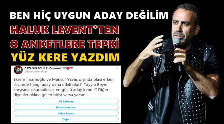 Twitter’da bir hesap, “Ekrem İmamoğlu ve Mansur Yavaş dışında olası erken seçimde hangi aday daha etkili olur? Tayyip Beyin karşısına çıkarabilecek en güçlü aday kimdir? Diğer diyenler aklına gelen birisi varsa yazsın” diyerek bir anket açtı. Söz konusu hesap anketteki seçeneklere, “Ali Babacan, Muharrem İnce ve Haluk Levent’in ismini yazdı. Levent söz konusu ankete sosyal medya hesabından tepki gösterdi.