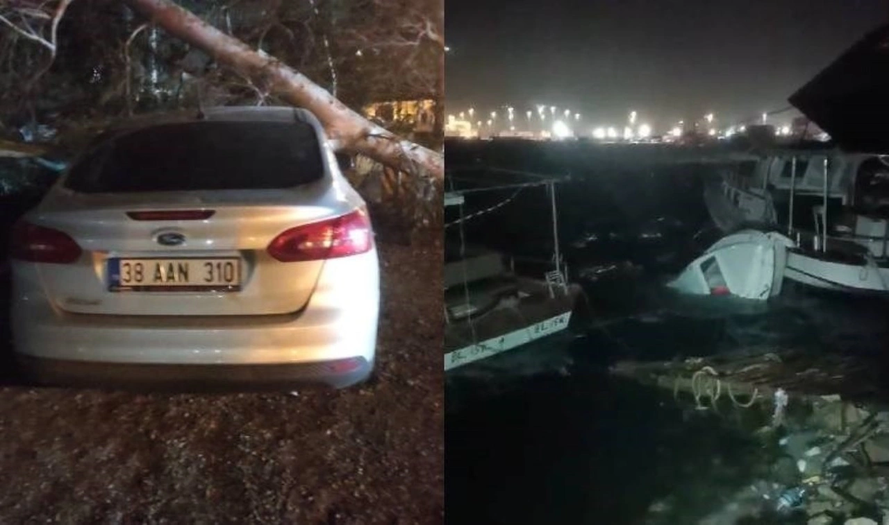 İskenderun’da fırtınanın etkisiyle devrilen ağaçlar da araçlara zarar verdi. Ekipler, alabora olan tekneler ve zarar gören araçlar için çalışma başlattı.