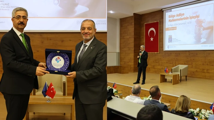 Bölge adliye mahkemelerinin kuruluşu, rolü ve işleyişi hakkında kapsamlı bir sunum gerçekleştiren Diyarbakır Bölge Adliye Mahkemesi Cumhuriyet Başsavcısı Ali İrfan Yılmaz, adliye sistemindeki mahkemelerin yapısı, işleyiş prosedürleri ve hukuki süreçler hakkında bilgi vererek, öğretim üyelerinin ve öğrencilerin sorularını yanıtladı.