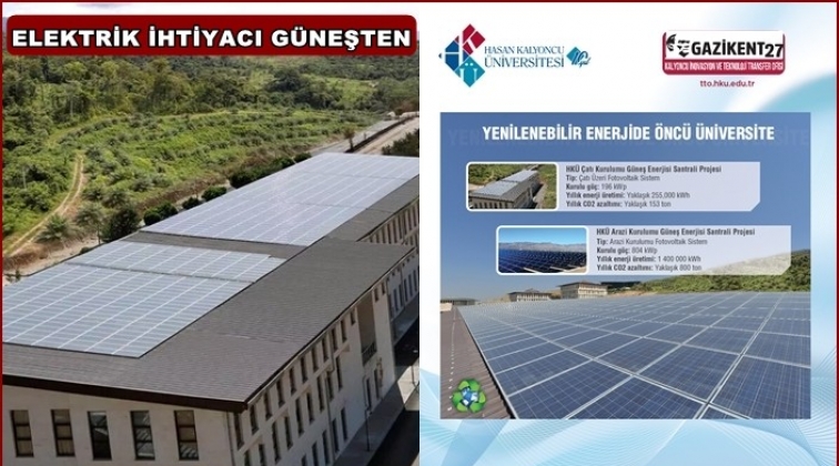 Teknoloji üretimi, edinimi ve kullanımı dâhil olmak üzere birçok alanda yeni projeler üreten Hasan Kalyoncu Üniversitesinin Sağlık Bilimleri Fakültesi bina çatısında ve HKÜ arazisinde 1.2MW kurulu gücünde, fotovoltaik teknolojiyi kullanan güneş enerji santrali bulunuyor. Santralin ürettiği enerji öncelikle öz tüketimde kullanılıyor.Santralin durumu ve üretim değerleri ise internet üzerinden anlık takip edilebilirken, her ay KALİTTO (Kalyoncu İnovasyon ve Teknoloji Transfer Ofisi) tarafından da rapor ediliyor. Bu bağlamda yılda 45.000 ağaç kadar CO2 emisyonu azaltılabiliyor.HKÜ bu tür çalışmalarıyla akıllı, yeşil ve sıfır emisyonlu üniversite hedefleri ile çalışmalarını sürdürüyor.