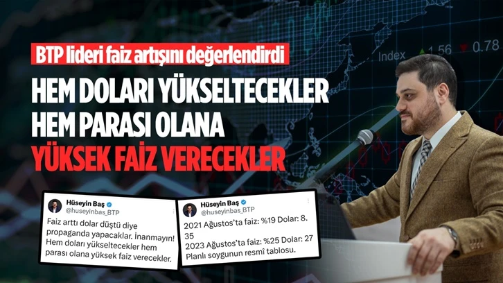 BTP Genel Başkanı Hüseyin Baş, “Faiz arttı dolar düştü diye propaganda yapacaklar. İnanmayın! Hem doları yükseltecekler, hem parası olana yüksek faiz verecekler” dedi.