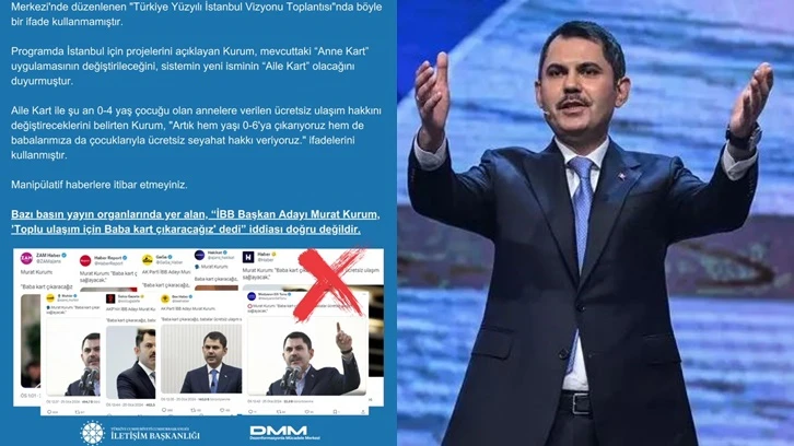 Yapılan açıklamada, “Bazı basın yayın organlarında yer alan ‘İBB Başkan Adayı Murat Kurum, ‘Toplu ulaşım için Baba kart çıkaracağız' dedi’ iddiası doğru değildir” denilerek şunlar kaydedildi: