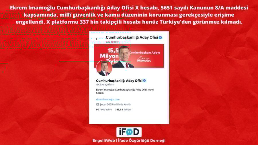 Tutuklu İBB Başkanı Ekrem İmamoğlu'nun X platformunda kullandığı 'Cumhurbaşkanlığı Aday Ofisi' hesabı üçüncü kez erişime engellendi.