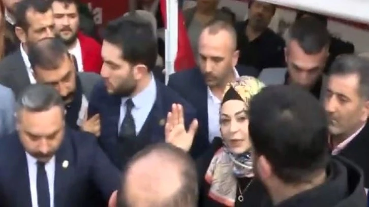 MHP Sancaktepe İlçe Başkanı Arzu Karaalioğlu, İmamoğlu ve ekibinin karşısına dikilerek çadıra girişlerine izin vermedi.