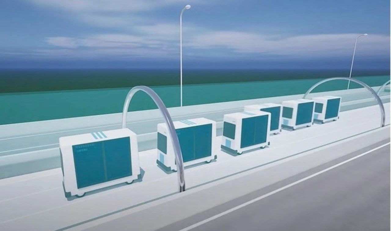 Hükümet tarafından hazırlanan bir bilgisayar grafiği videosunda, büyük bir otoyolun ortasında “otomatik akış yolu” olarak da adlandırılan üç şeritli bir koridor boyunca hareket eden büyük, tekerlekli kutular gösteriliyor.