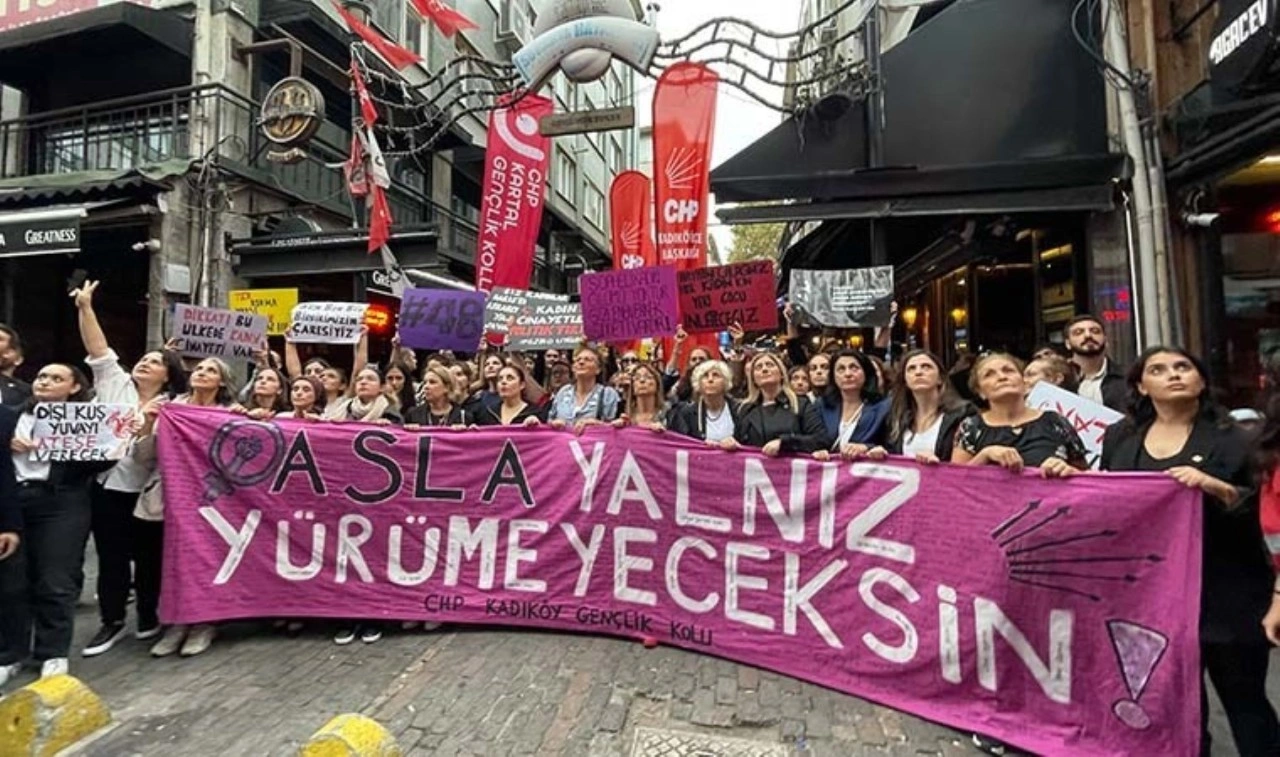 Kadın örgütleri, kadına yönelik şiddeti ve cezasızlığı protesto için Kadıköy Süreyya Operası önünde bir araya geldi. CHP Kadıköy İlçe Örgütü'nün de destek verdiği eylemde kadınlar, cinayete kurban giden kadınların fotoğraflarıyla birlikte "Kadınlar ölüyor iktidar susuyor", "Narinler okula, mezara değil", "AKP seyretme yasayı uygula", "Bir kişi daha eksilmeyeceğiz" sloganları atarak, Kadıköy İskele Meydanı'na doğru yürüyüşe geçti.